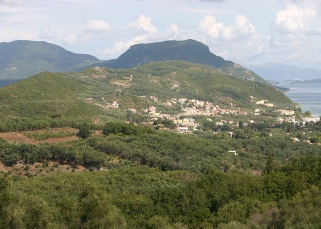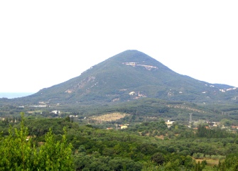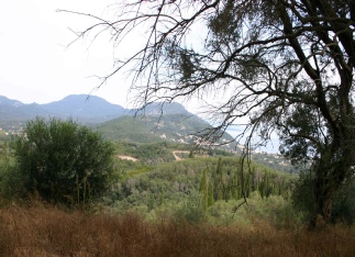 When you reach a left hand bend ignore a track to the right and carry on up through the olive groves passing a tin shed, an old well and a track on the right still keeping the open views. Then almost immediately on the right is the view of Aghios Matheos mountain.