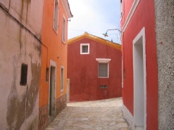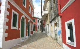 At the next junction beside a church turn left and then around to the right passing two bench seats and then between brightly coloured red houses. Bearing around to the right you come out into a round patterned cobbled village square. Here turn left along a wider paved village lane, with open country side to the left and views over to the west coast, to join a tarmac road. You pass a cafe on the right with tables to your left and then another cafe/taverna on the left and eventually reach a road junction. Here turn left and head down the hill passing a white shed and a track on the left. Here the road bends around to the right. Carry on down. Just before a road sign on the right hand side, beside a track going up to a house, turn off left down a rough stony track. This takes you down through olive groves winding around to the right to eventually reach the tarmac road again. (If you wish you can instead continue walking around the road to take in the splendid views of the coast down to Aghios Georgios). Here turn left and head down the road with the views of the coast in front of you and carry on back to the start.