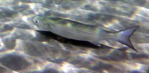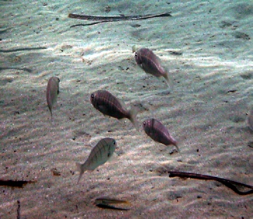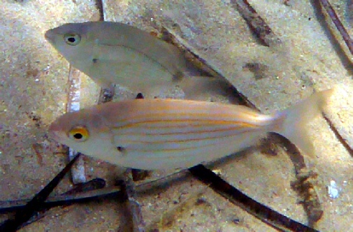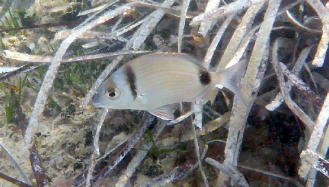 Lithognathus mormyrus or striped sea bream is more often seen in groups of two or three or with other species of fish.